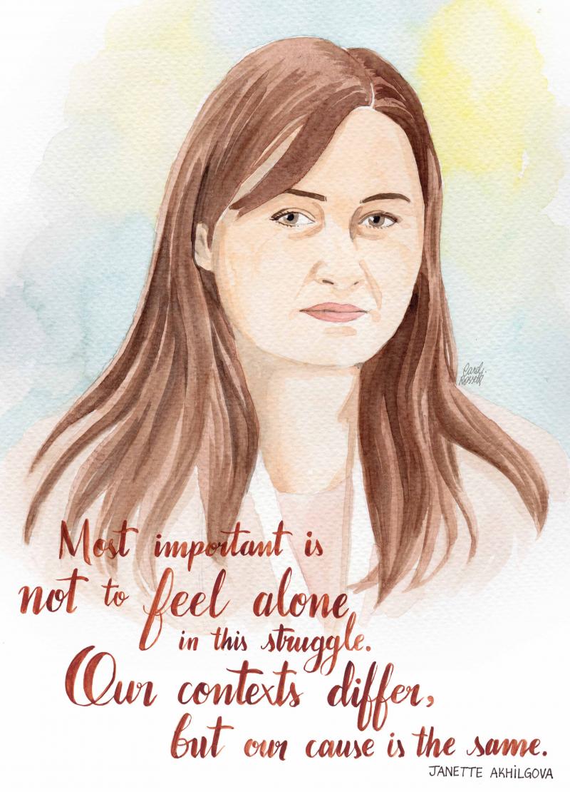 Janette Akhilgova trabaja con Peacebuilding UK en la región del Cáucaso Norte en Rusia así como también es la Presidenta del Consejo de RC-DEV, una organización sin fines de lucro en Ingushetia. Rusia es una sociedad multiconfesional y que enfrenta varias formas de fundamentalismo. En el Cáucaso Norte con una mayoría musulmana, el gobierno y la sociedad civil han realizado algunos intentos para atender el avance de los fundamentalismos, sin embargo, Janette advierte que estos siempre desatienden la dimensión de género del problema. Janette trabaja en el establecimiento de plataformas más sólidas para la discusión y la concientización a cerca de los fundamentalismos y sus impactos en las mujeres. Ella espera lograr más solidaridad por parte de quienes se oponen al fundamentalismo en Rusia, así como también de otras personas en su región, y de aliadxs en otros países.