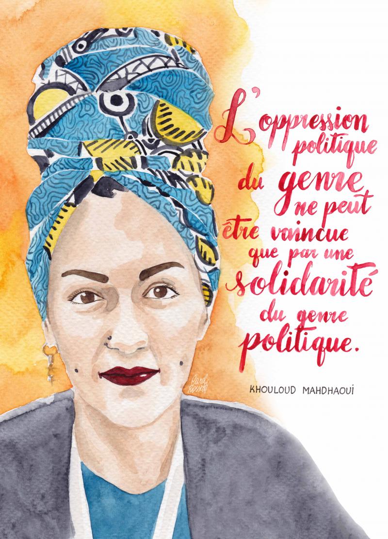 Khouloud Mahdhaoui es Presidenta de Chouf, una organización feminista de Túnez que en 2014 comenzó con un proyecto denominado Choufthouhonna, un Festival de Arte Feminista en Túnez. Choufthouhonna fue la respuesta a la falta de un espacio público abierto a la expresión de las mujeres, un problema relacionado con la predominancia de los discursos fundamentalistas en el Túnez postrevolucionario. Khouloud describe el festival de arte como un desafío a las reglas del fundamentalismo por medio de la «apertura de las calles a las voces y cuerpos de las mujeres». La cita en la fotografía de Khouloud captura la idea de que la opresión basada en el género solo puede ser superada por medio de políticas de solidaridad entre aquellas personas que experimentan la opresión por sí mismas. Khouloud considera al feminismo inclusivo y diverso encarnado en Chouftouhonna como algo emblemático de su visión hacia un futuro feminista: «un mundo en el cual las personas puedan ser diferentes pero seguir siendo iguales, y en el cual se unan por el amor.»