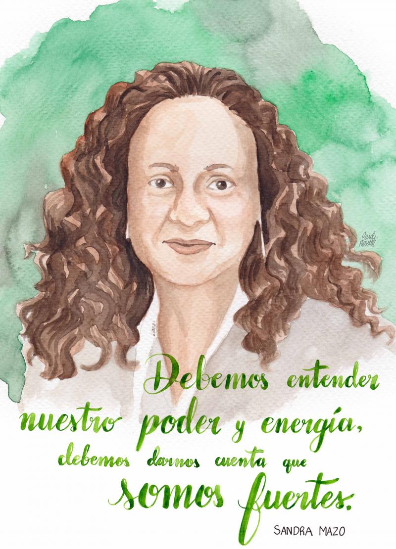 Católicas por el Derecho a Decidir – Colombia (CDD-Colombia), la organización con la que trabaja Sandra Mazo, lidera una campaña por un estado laico en Colombia, y a lo largo de toda América Latina. La campaña de CDD-Colombia articula la voz de las mujeres católicas que no se sienten representadas por el punto de vista de la ortodoxia católica y no aceptan la imposición de la visión de la Iglesia en las políticas públicas. Los videos de la campaña han facilitado una mejor comprensión del significado real del laicismo, y la promesa que este ofrece de una sociedad democrática en la cual los derechos de todas las personas estén garantizados. Cuando hablamos sobre el retroceso que lxs activistas por los derechos de las mujeres enfrentan, Sandra lo ve como algo positivo, ya que sostiene que esto es un signo de todos los modos en los cuales el feminismo está ganando. Esto mismo se refleja en la cita seleccionada para su retrato.