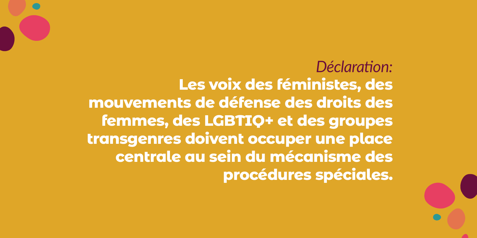 Como sociedad civil, tenemos legítimo interés en la integridad y credibilidad de los Procedimientos Especiales de la ONU. Mantenemos el apoyo a los mandatos de los Procedimientos Especiales como mecanismo para el progreso de las normas y el discurso de los derechos humanos, incluidos los derechos asociados a las cuestiones de género y la sexualidad. No obstante, no podemos hacer todo esto en soledad, sin la voluntad política de quienes ostentan cargos de poder en el seno de los sistemas. Insistimos en que la rendición de cuentas ante las personas titulares de derechos se centre en el trabajo de los Procedimientos Especiales, y en el cese de las prácticas perjudiciales. Las voces y preocupaciones de los movimientos feministas, por los derechos de las mujeres y de las personas LGBTIQ+, en particular de los grupos de personas trans*, deben ocupar un lugar central en lugar de quedar relegadas a los márgenes.