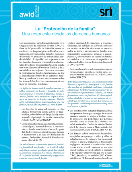 La legislación internacional de derechos humanos establece claramente los derechos y libertades de los individuos en el contexto de la familia, aunque la ‘unidad familiar’ no es en sí misma ni por sí misma sujeto de protección de derechos humanos. Todos los individuos tienen iguales derechos a una vida familiar, la cual debe ser garantizada por el Estado.
