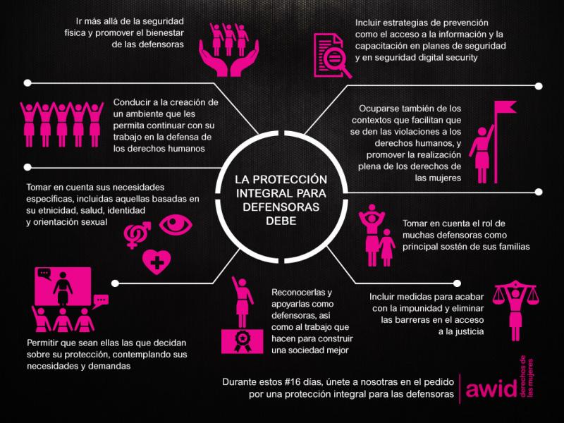 En esta serie de imágenes resaltamos las componentes clave de la protección integral para las defensoras de derechos humanos. ¡Súmense a nuestros esfuerzos compartiendo estas imágenes y alzando la voz sobre la necesidad de proveer protección integral para las defensoras!