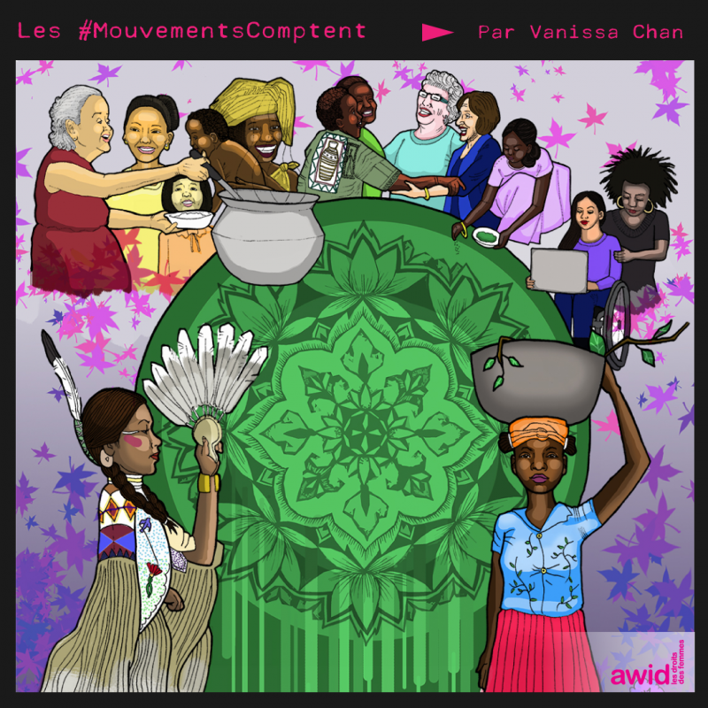 Elle illustre cette idée de rassemblement avec un mandala entouré de femmes qui se saluent, apportent de la nourriture pour les autres et travaillent ensemble. Les deux femmes qui se distinguent du groupe devant le mandala représentent celles qui sont en première ligne et symbolisent la solidarité envers leurs luttes d’envergure mondiale.