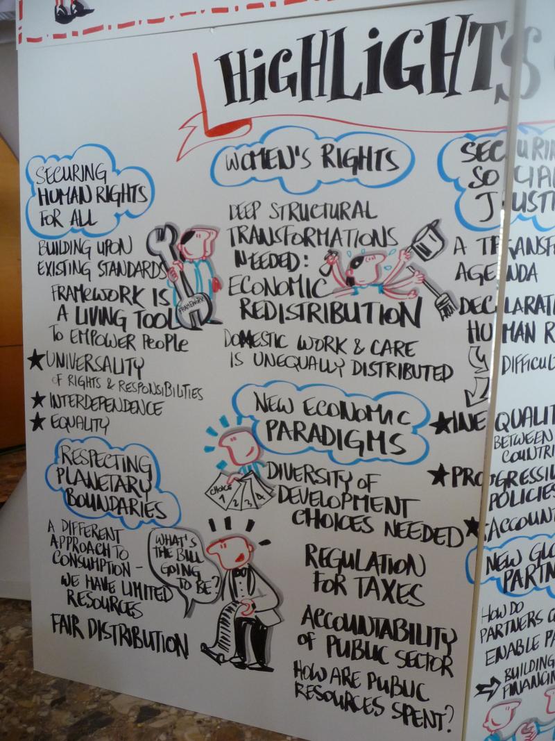L'un des messages centraux de la conférence est que tout programme de développement doit être ancré dans l'architecture internationale existante de droits humains, à savoir les droits économiques, sociaux et culturels, les droits des femmes (y compris les droits sexuels et reproductifs), les droits à l'emploi et les droits au travail, ainsi que les droits des populations autochtones, des communautés socialement marginalisées, des enfants, des migrant-e-s, des personnes présentant diverses orientations sexuelles et identités de genre et tous ceux qui vivent avec des handicaps, entre autres droits.[2]