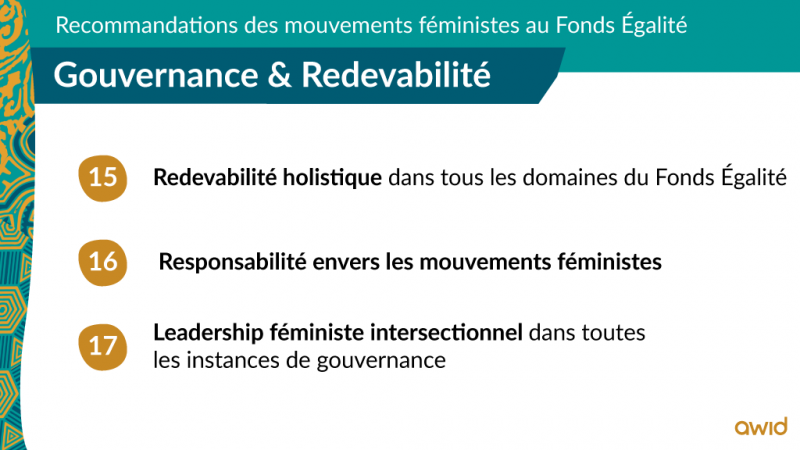 Le rapport comprend également des recommandations sur les modes de gouvernance intégrant réellement une redevabilité féministe.