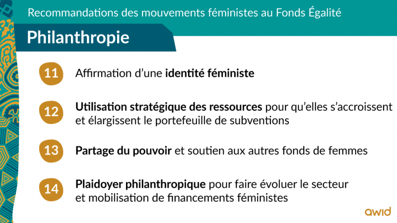 • Prendre part au plaidoyer philanthropique pour faire évoluer le secteur et mobiliser plus de financements féministes.