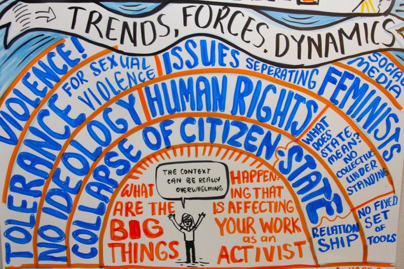 Major discussion points around the closing space for civil society arose, with some areas of constant concern being funding, institutionalisation and the politics of power therein. Language use and co-optation into externally driven agendas, as well as unfinanced demands for evidence and baseline findings before grants are allocated, were seen a key challenges.
