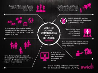This set of infographics share key components of holistic protection for women human rights defenders (WHRDs). Download and share these graphics and help bring attention to the need to provide holistic protection for WHRDs.