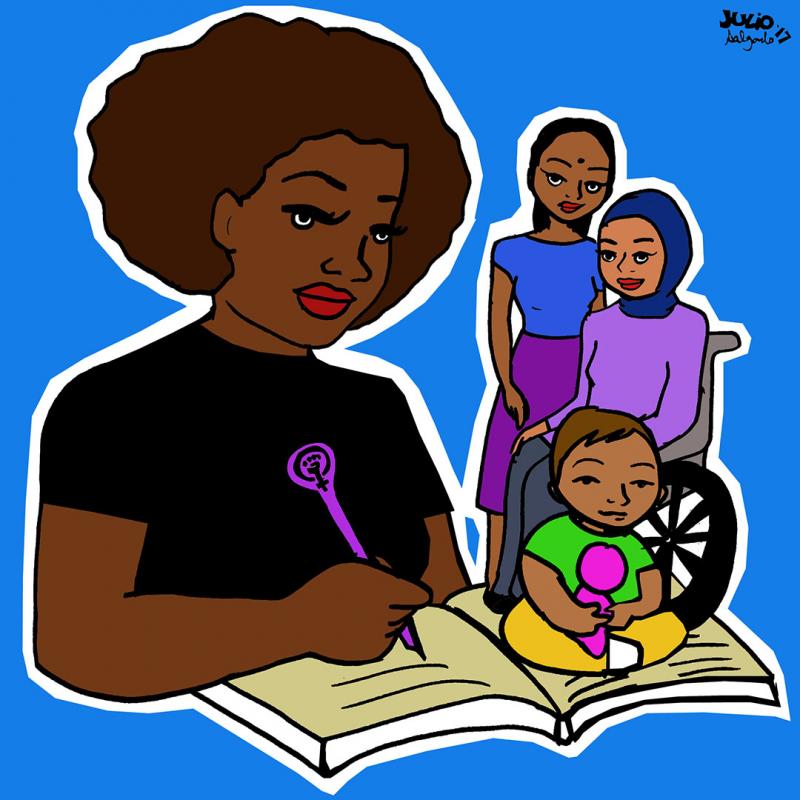 Julio Salgado depicts the translating of feminist theory into practice, over generations: the illustration represents important theories written by Black feminists, and the people that bring those theories to life.
