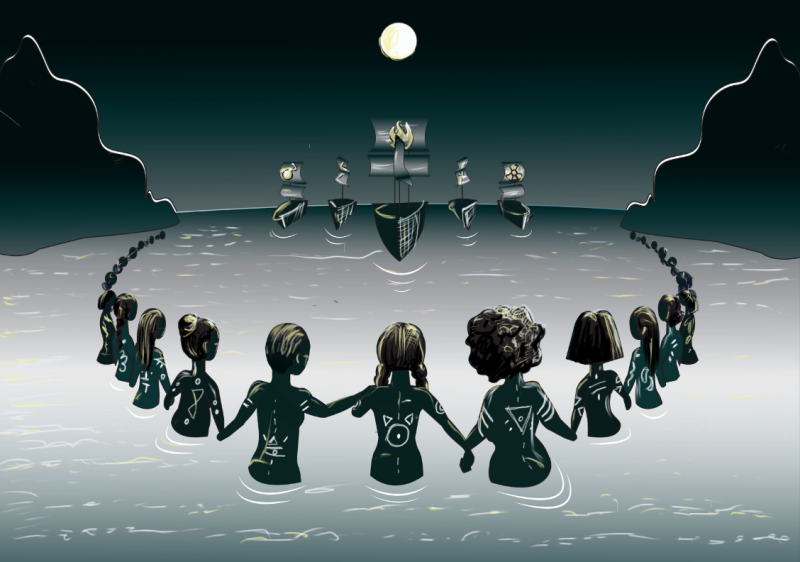 Pia Love’s travels have inspired her illustration, which reflects women coming together with a desire to be liberated and find their power. They hold hands in solidarity, surrounded by elements in nature that echo this power.